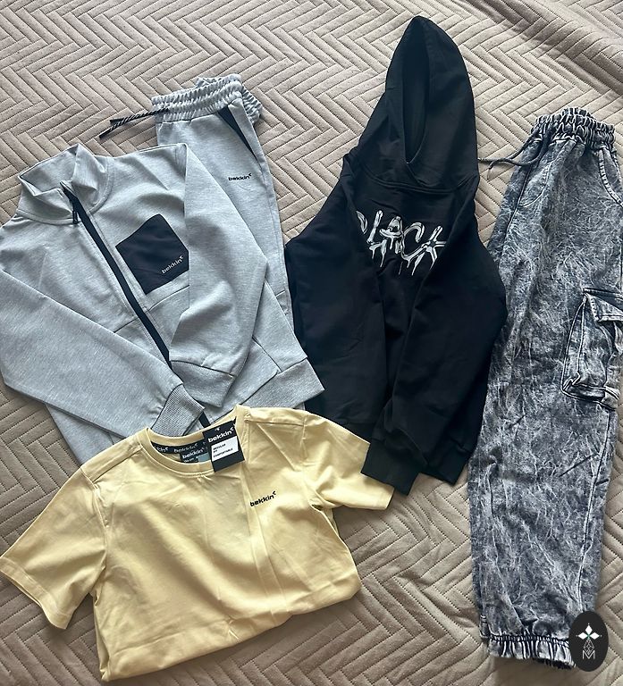 Dydis kiekvienam vienetui 10y. Komplekte yra kelnės ir du viršutiniai drabužiai.