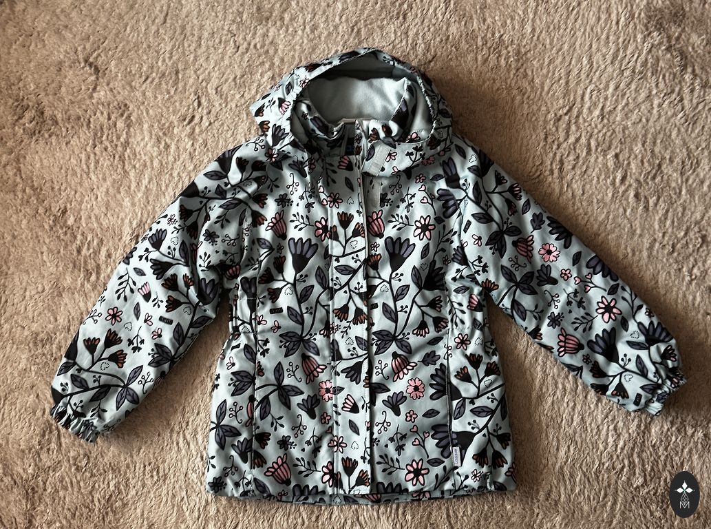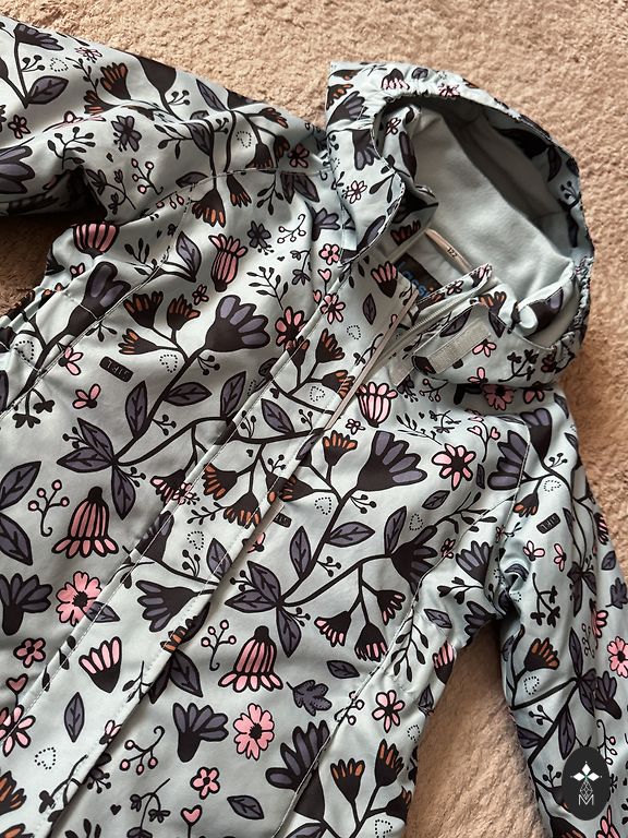 Удобная куртка для весны с пушистым, подкладочным внутренним слоем и светоотражающими элементами. Есть дефект - виден на последней фотографии - небольшие пятна на правой руке, не очень заметные.