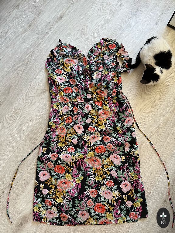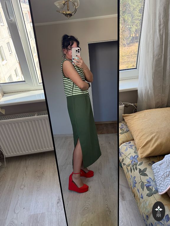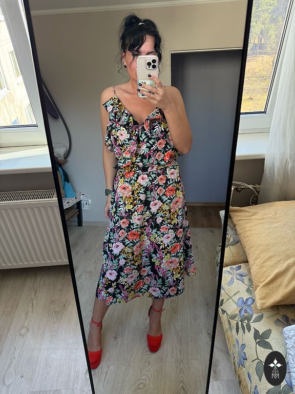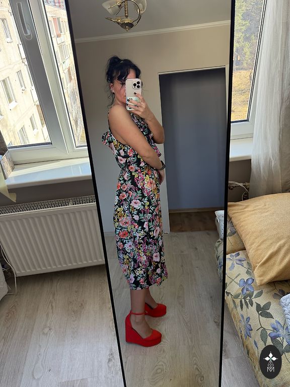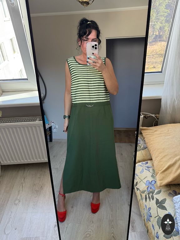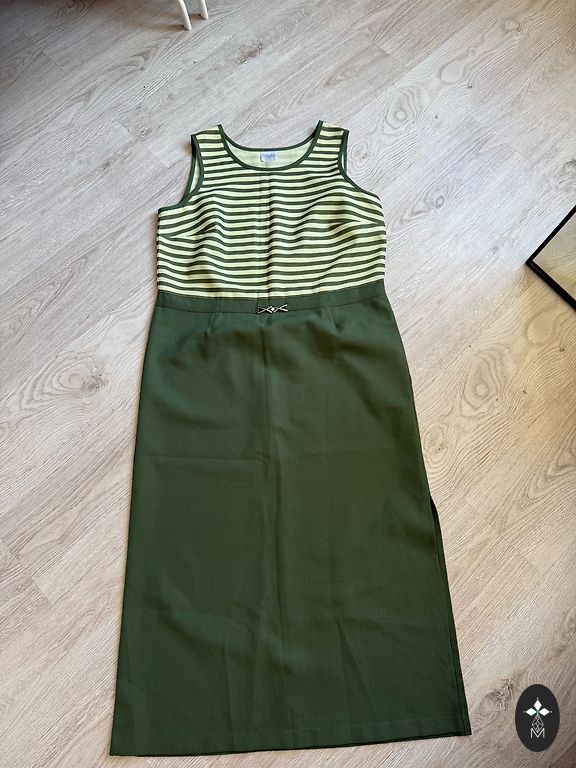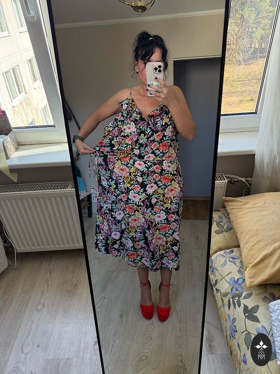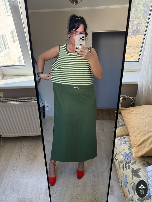 Patogi, laisva, mišraus lino suknelė, nesiglamžo. Yra kišenės. Man XL ir per didelė. Parašytas dydis 50.