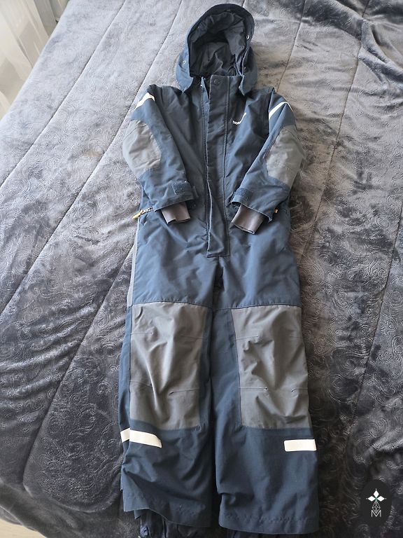 Talvejope, komplektis pükstega. Pükste põlved on kulunud ja veidi rebenenud. Jope pole kahjustuse märke.