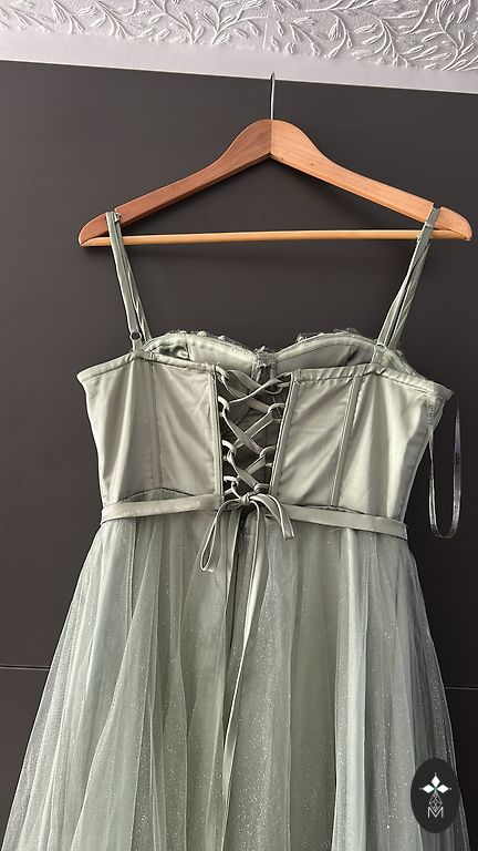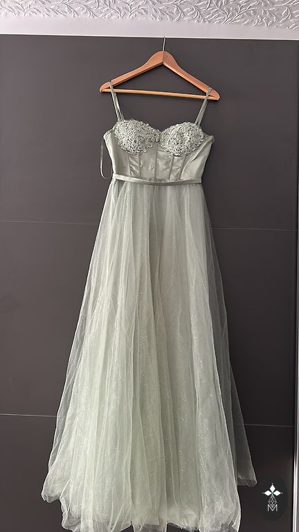 Miško žalios spalvos JARLO vakarinė suknelė. Užsegimas nugaroje su užtrauktuku. Krūtinės dalyje paminkštinimai, volanai, galima dėvėti be liemenėlės. Petnešas galima užsidėti ir ant pečių. Apačioje yra pamušalas. Priekyje ant kojos skeltukas. Nugara pailginta. Dydis nurodytas UK12, M/L. Ilgis nuo peties priekyje 148 cm, nugaroje 170 cm. Krūtinės apimtis 48-50 cm, liemens 38-40 cm, klubai 48-51 cm. Suknelė dėvėta 1 kartą. Kaip trūkumą nurodau šone mažus siūlus nuo rankinės ir ant volano lygintuvo dėmelę. Pirkta už 260€.