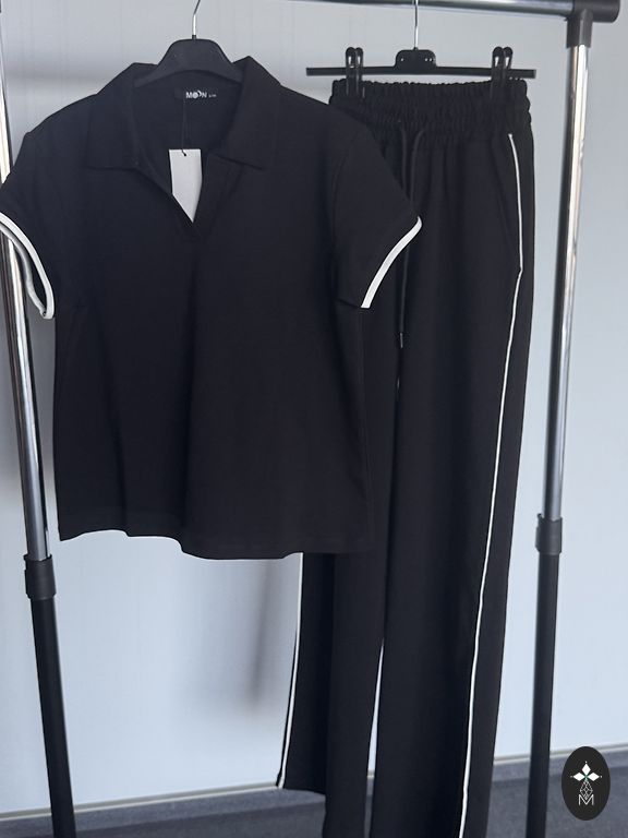 Juodas komplektas su polo tipo viršutine dalimi ir plačiomis kelnėmis.