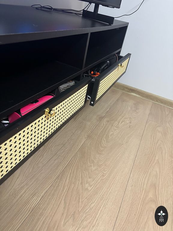 Yra įbrėžimų, viršutiniame stalčiuje yra nedidelė (taškinė) deformacija, tai matyti nuotraukoje.