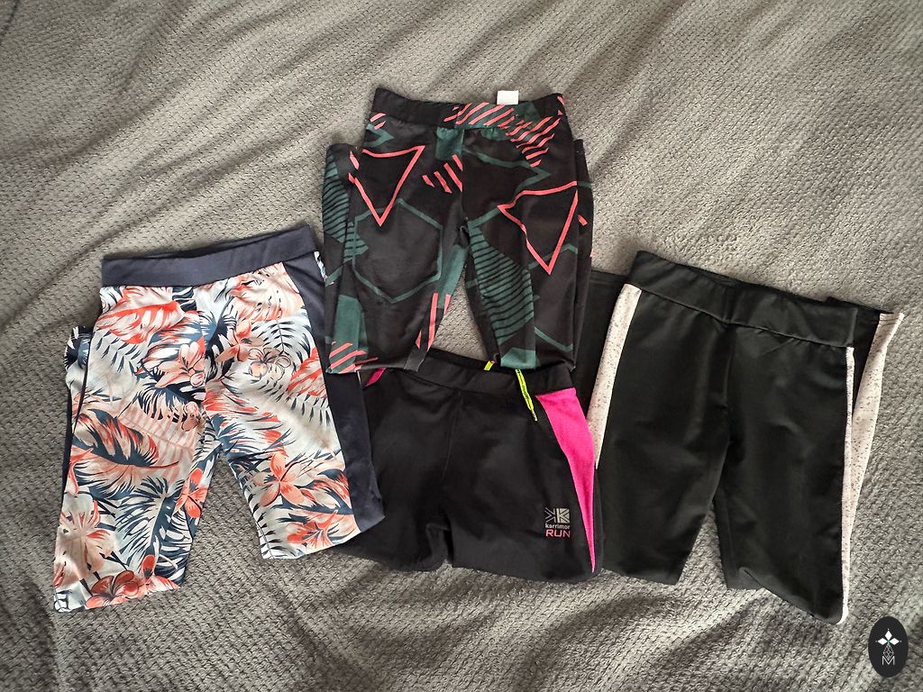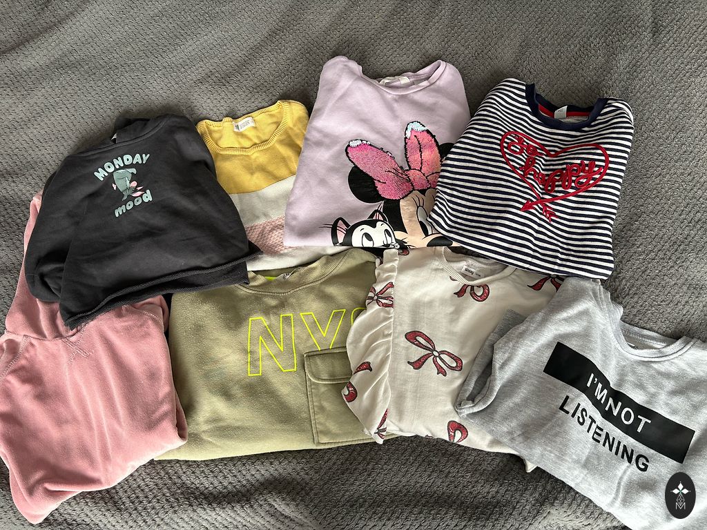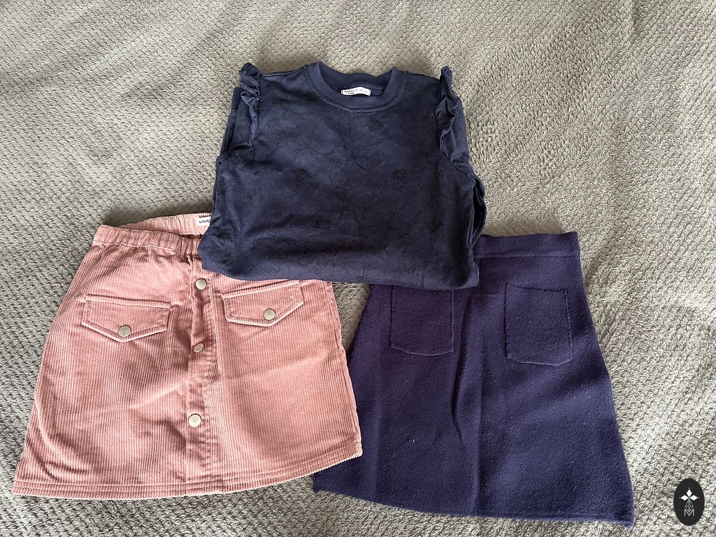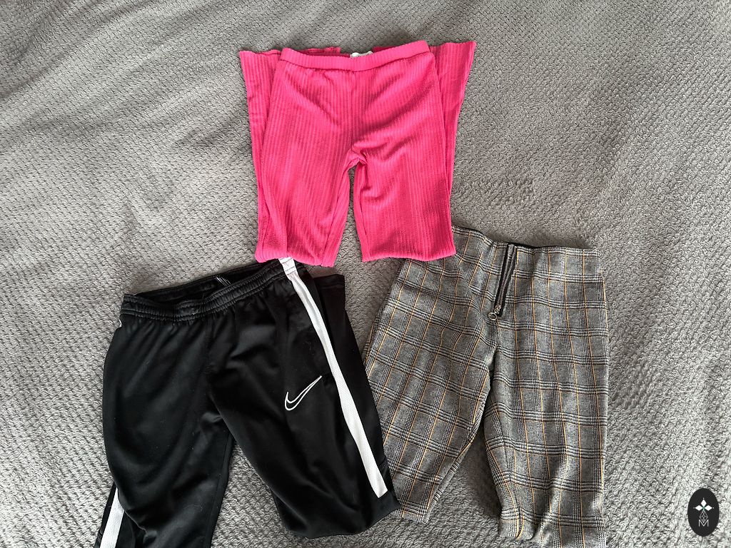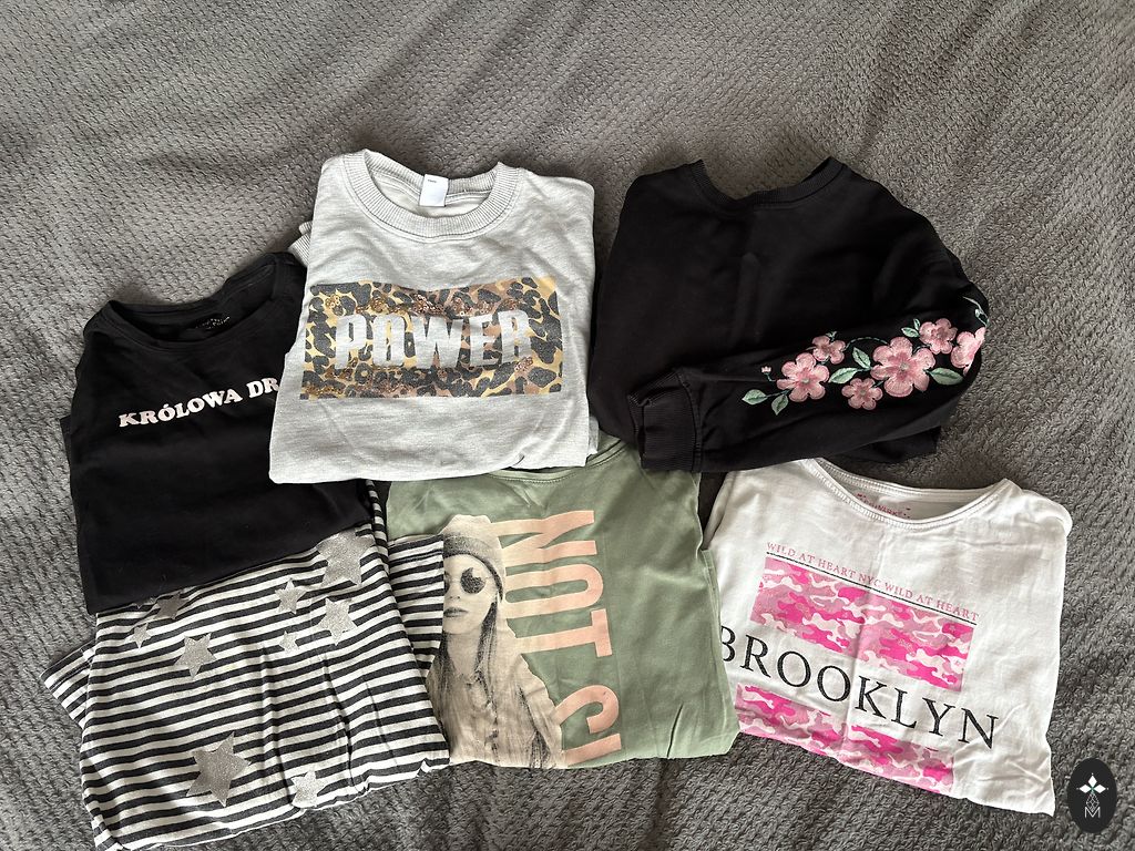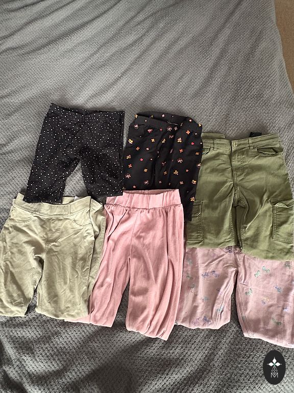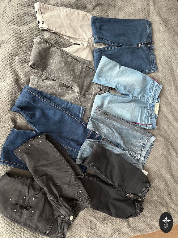 Set of 3 pants, all marked size 140 (fits). The waist is adjustable. And 3 long-sleeve tops marked size 134/140. No defects.