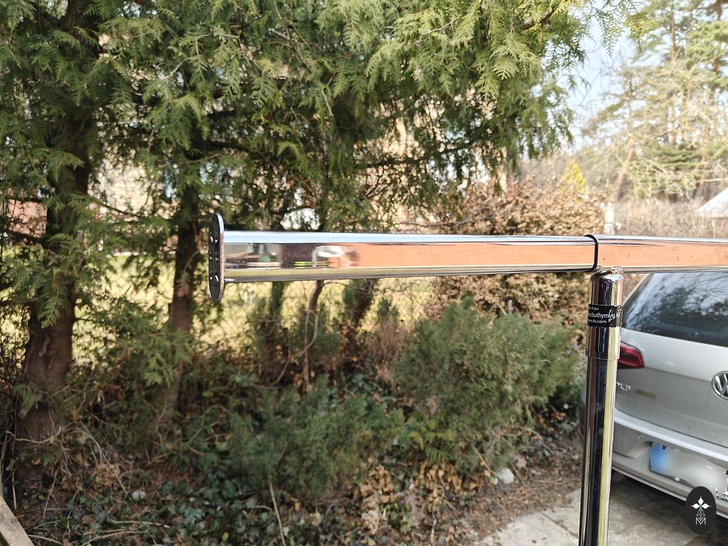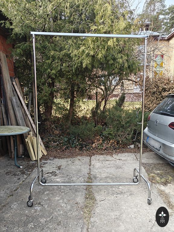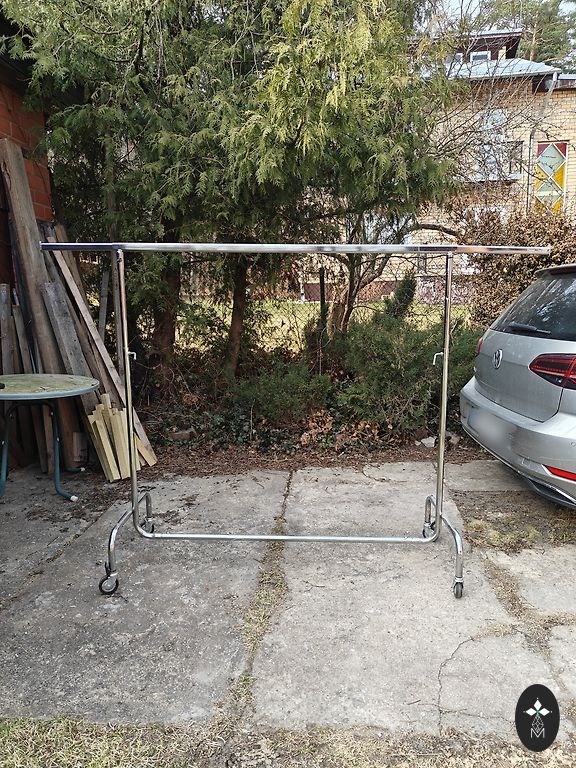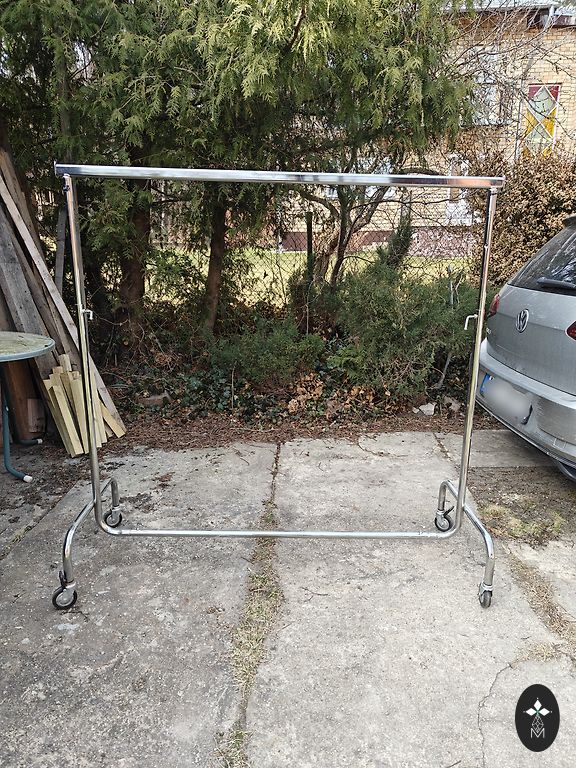 Chromuotas apvalus drabužių stovas / rėmas. Su ratukais. Reguliuojamas aukštis. Susideda iš dviejų dalių. Ziepniekkalns.