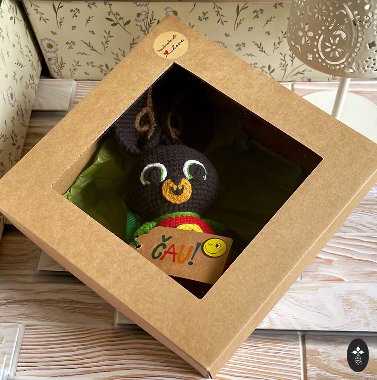 Boružė 22-25 cm. Medžiagos: pusiau medvilnė, akys saugiai pritvirtintos. Užpildas - holofiberio rutuliukai. Priežiūra: plauti rankomis arba mašina medvilnės temperatūros režimu, nesukti, o švelniai spausti, džiovinti džiovyklėje, draudžiama tiesioginiai saulės spinduliai, radiatorius.