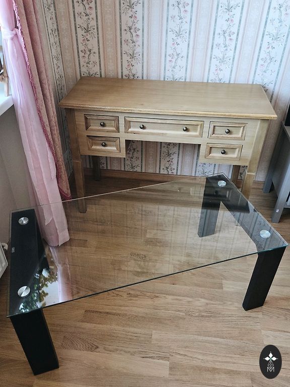 Ovalus žurnalinio staliuko dizainas mid-century modern stiliuje. Stalviršis pagamintas iš grūdinto tonuoto stiklo su dekoratyviniu ornamentu. Pagrindas – iš MDF su natūraliu riešutmedžio lukštu, lakuotas. Konstrukcija dviejų lygių su papildoma lentyna. Stabilus, patogus svetainėje.
