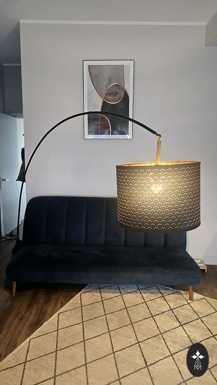 Немного использованная торшерная лампа с сероватым абажуром.