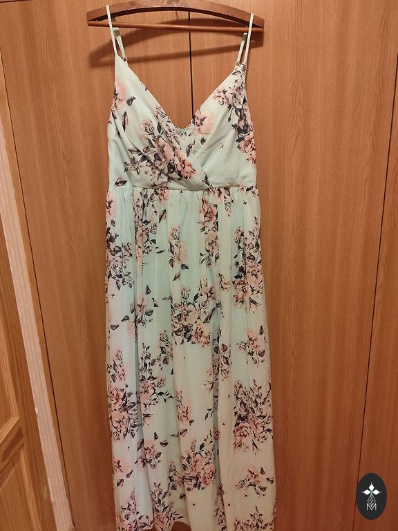 Nauja Klerr suknelė. Nurodytas vienas dydis. Tiks S/M dydžiams. Taip pat mažam L. Liemuo labai gerai tempiasi. Petnešos reguliuojamos. Fantastiškas skeltukas, audinys labai daug persidengia visiškai dvigubai. Spalva perlamutrinė rožinė.