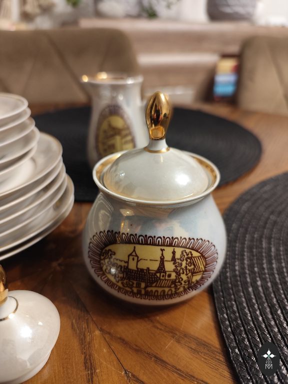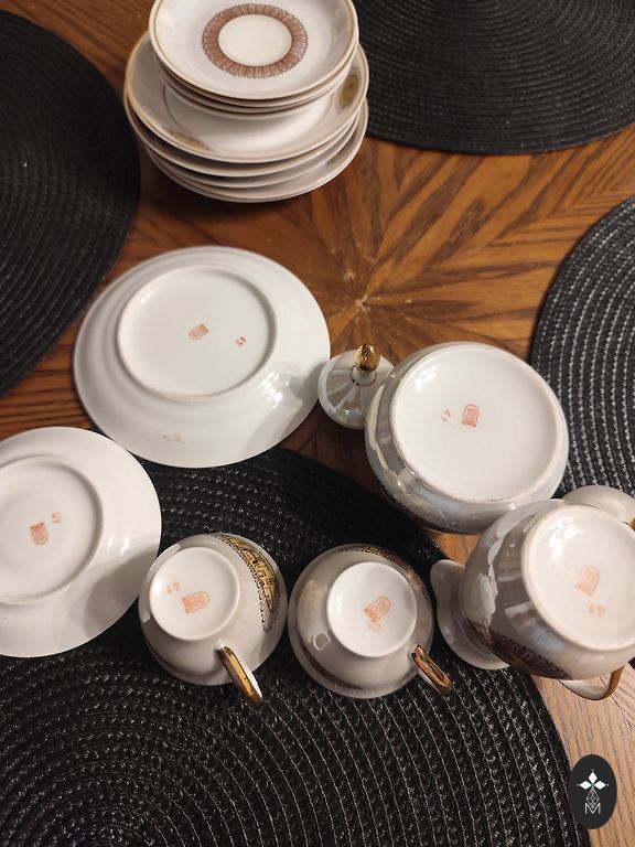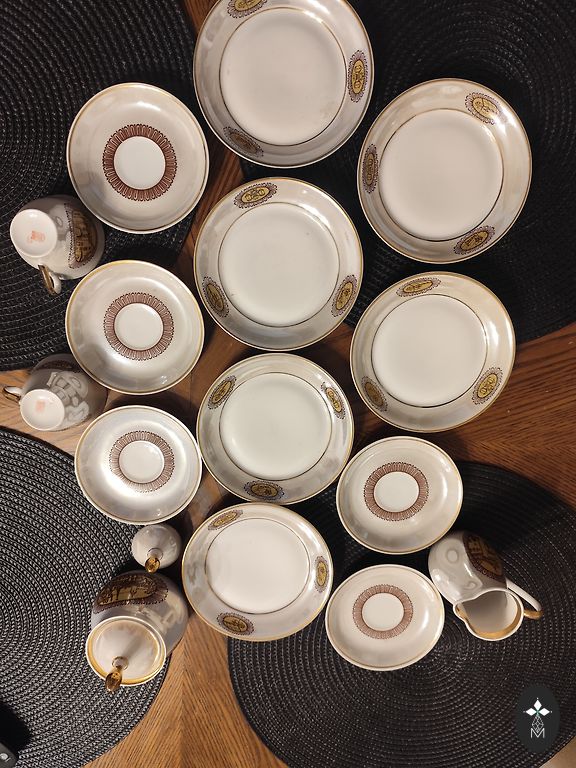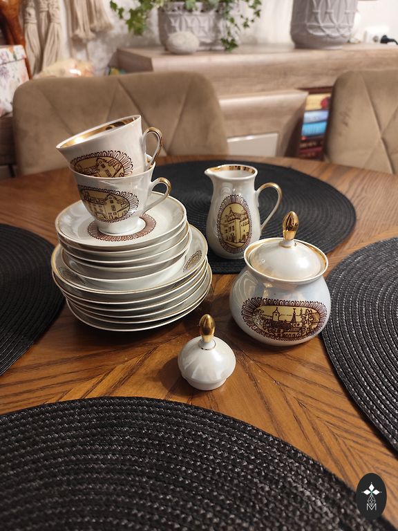 В хорошем состоянии. Без сколов или трещин. Центральные, блюдца без дефектов, как новые. Позолота на ручках чашек немного потерта. Отправляю безопасно упакованные из Литвы +2€.