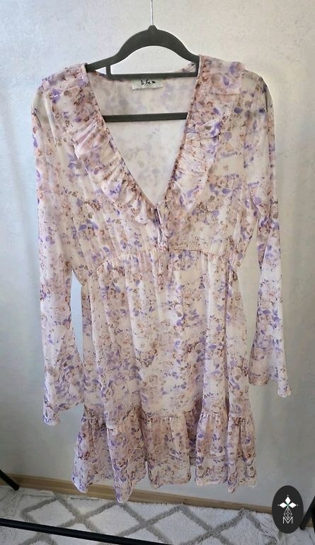 Ilus kleit suurepärases seisukorras, sobib suurusele M/L, taljes on kummipael, samuti on kummipael varrukatesse sisse pandud, sügav dekoltee.