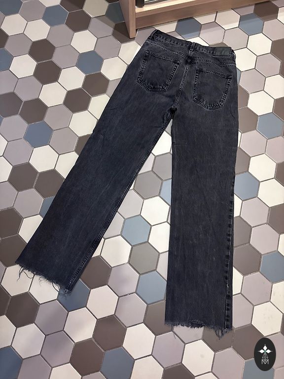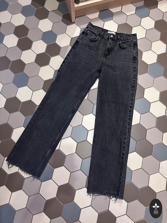 Серые, прямого кроя брюки, подходят для размера 38.