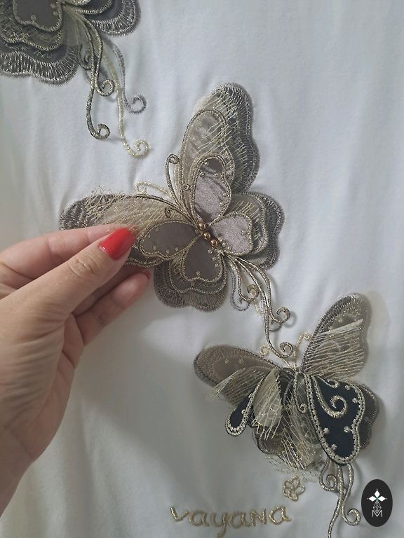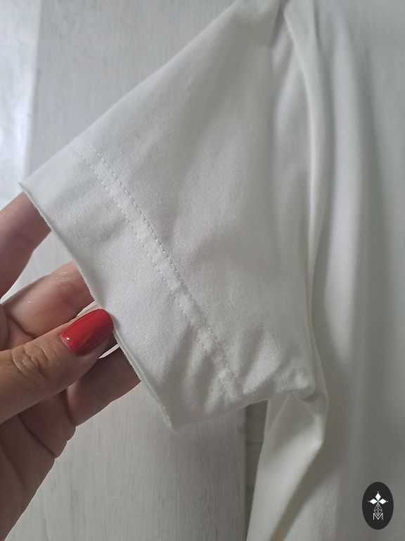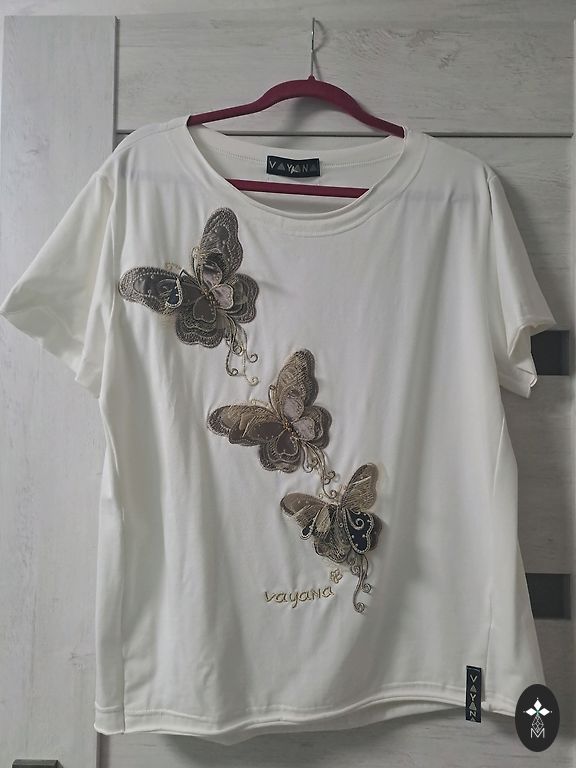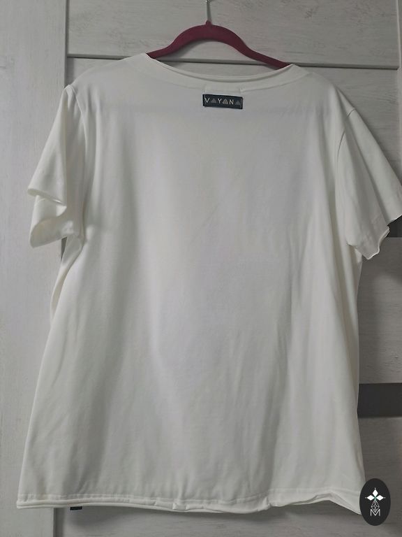 Классическая футболка XL из тонкого хлопка. Добавленная ценность — нарисованная корона ELITA, напечатанная блестящим фиолетовым на зелено-сером фоне. Современное сочетание цветов. Эффектная жемчужина.