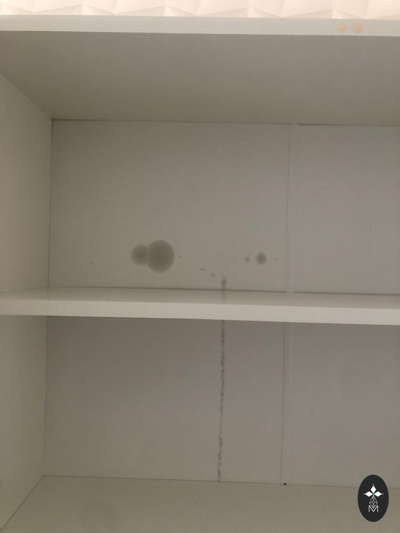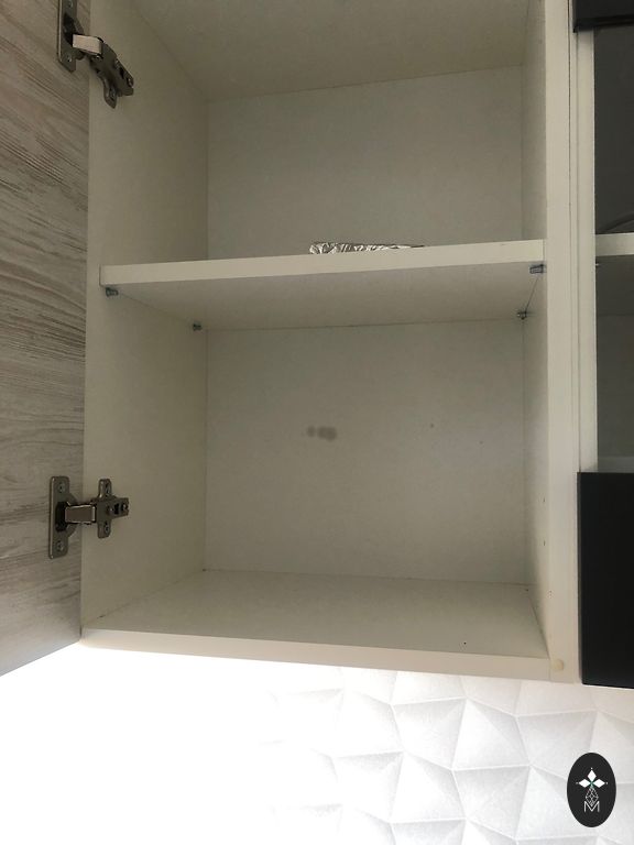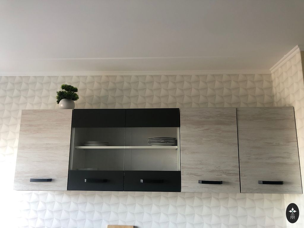 Kitchen equipment upper cabinets glossy white. Width 240cm and height 105cm, 2× 80cm and 2× 40cm cabinets with 3 shelves. Started to be screwed together.
