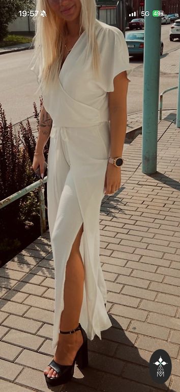 Белый льняной костюм улучшает состояние. Брюки с карманами, сбоку молния.