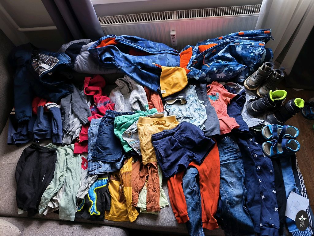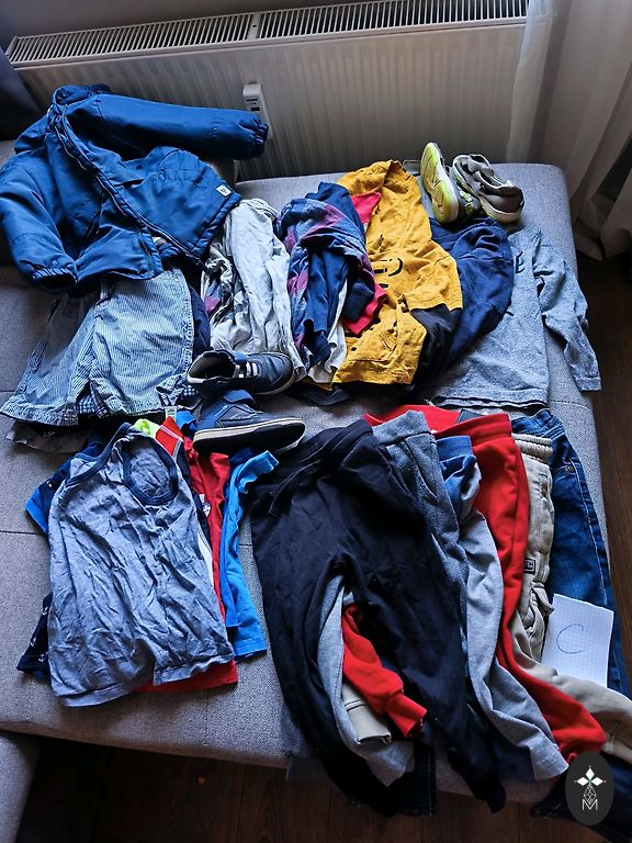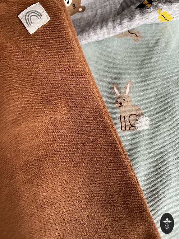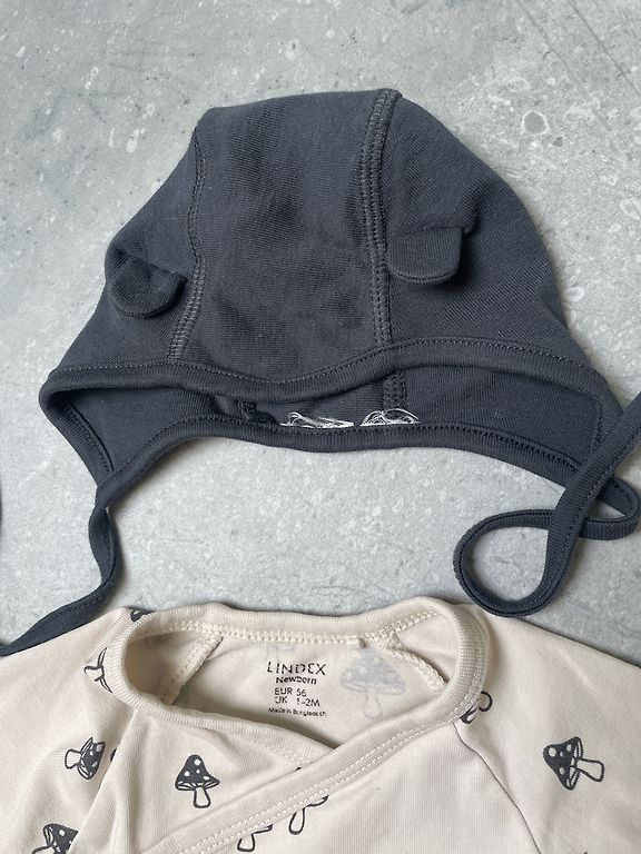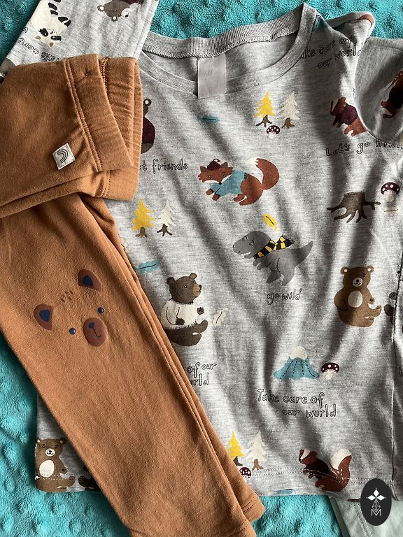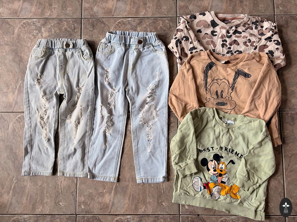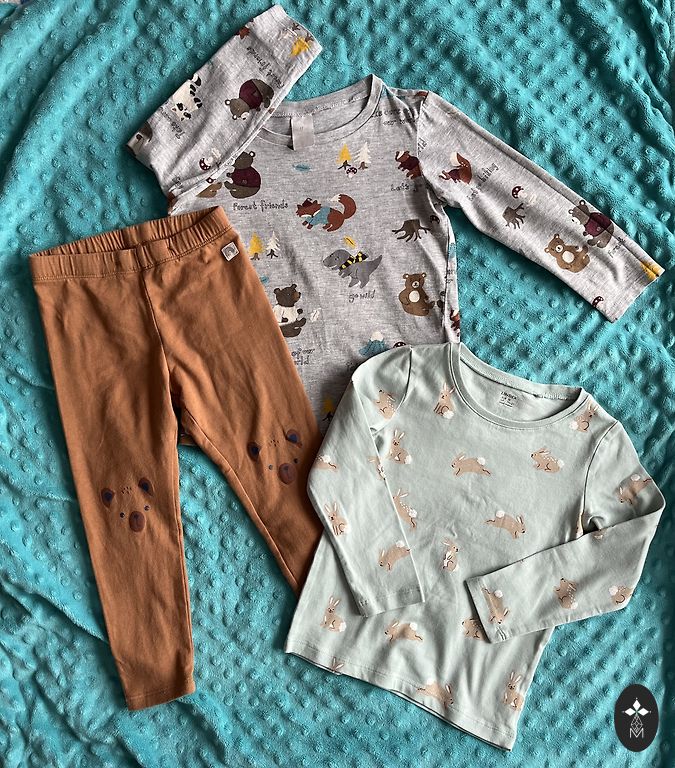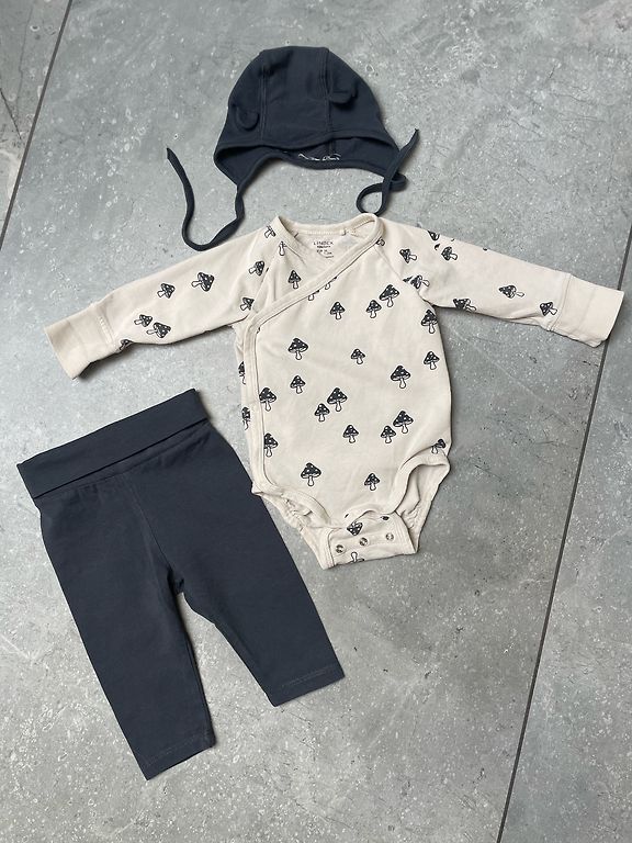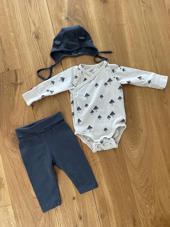 Drēbītes lieliskā stāvoklī, tikai bodijam ir blāvi, neizteikti pleķīši. Bodijs un zilās lenčbikses no wooly organic, linīgās lenčbikses no Zara un citronu romperītis no My wear.