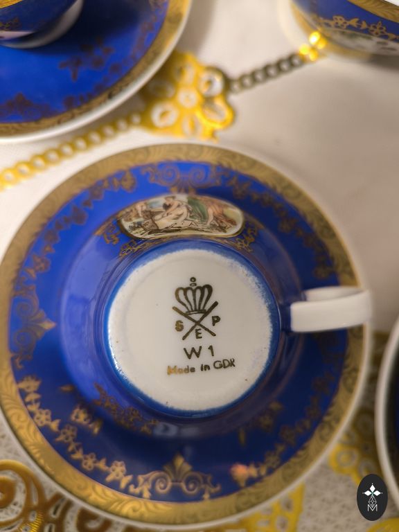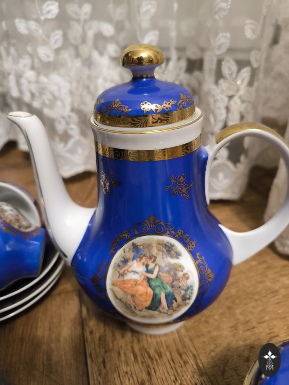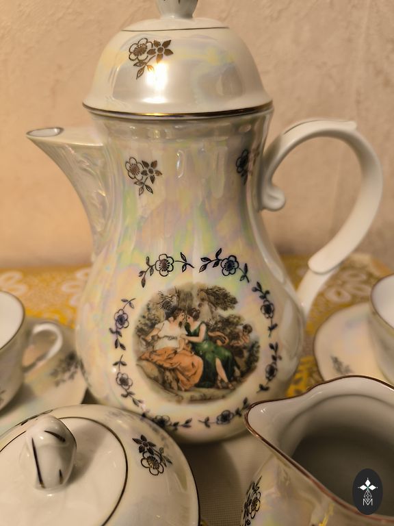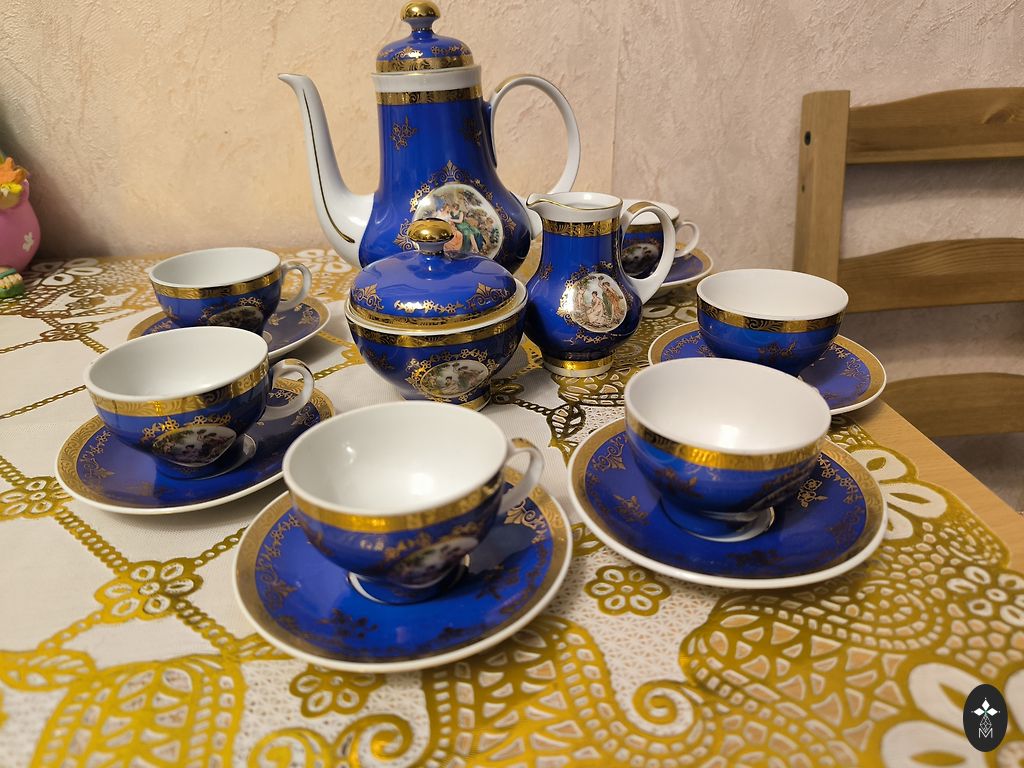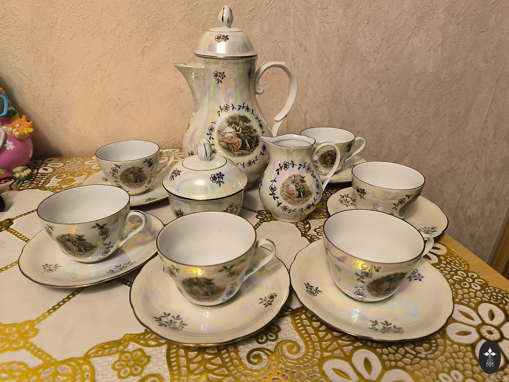 Rīgas Porcelāna rūpnīca (Riia portselanitehas) toodetud teekomplekt. Koosneb viiest esemest. Värv - aprikoos.