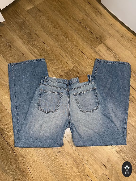 Beige jeans. Composition includes elastane. Features functional pockets at the front and back, belt loops, zipper and button closure. Size L (46), length 92 cm, inseam length 64 cm, waist 47 cm.