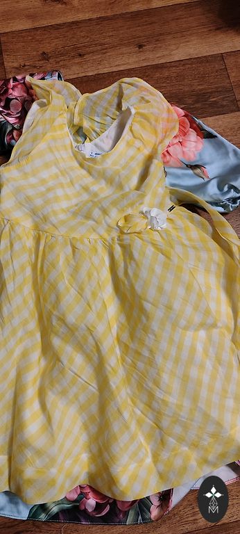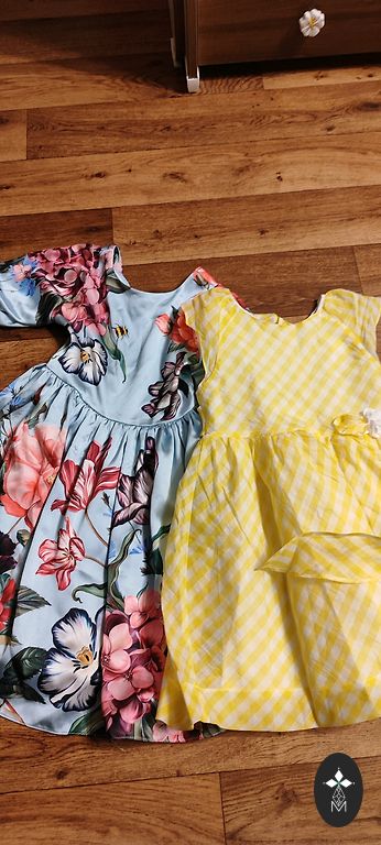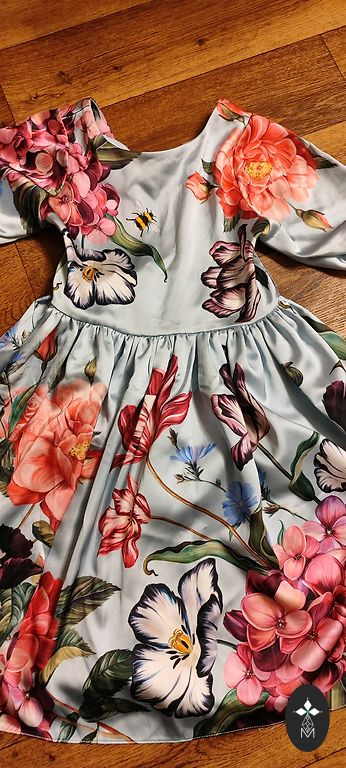 Labai graži, pūsta suknelė su gėlių raštu. Dydis 104-110 (atrodo, kad gali tikti ir didesniam dydžiui). Plačiai kirpta, nesiglamžo, tampri. Šiek tiek dėvėta. Plotis po pažastimis - 31 cm; rankovėse, kur yra guma - 8 cm, ilgis - 58 cm.