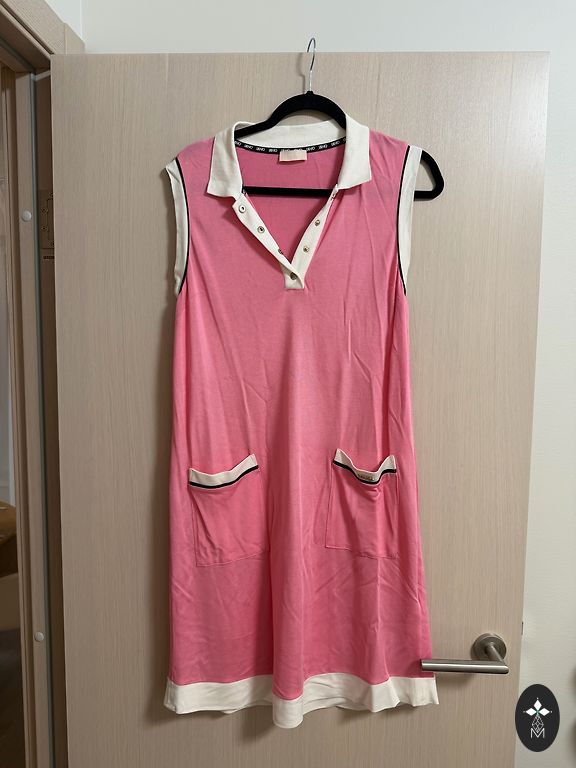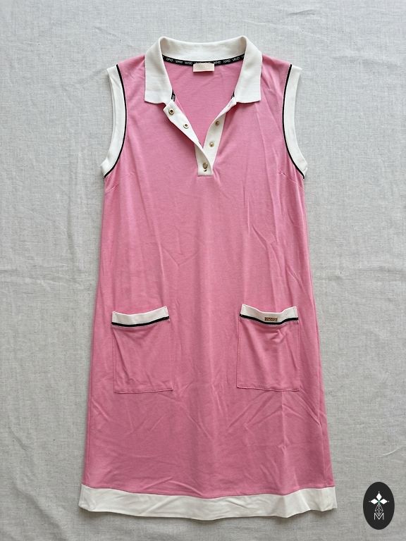 Suvama suknelė, surišama dirželiu. Liemuo apie 42 cm (padėjus plokščiai), galima sutraukti arba atlaisvinti diržu.