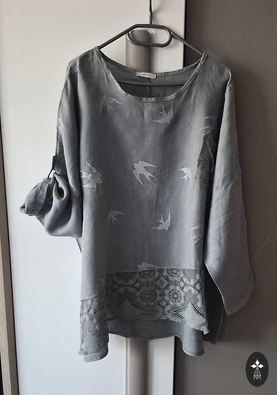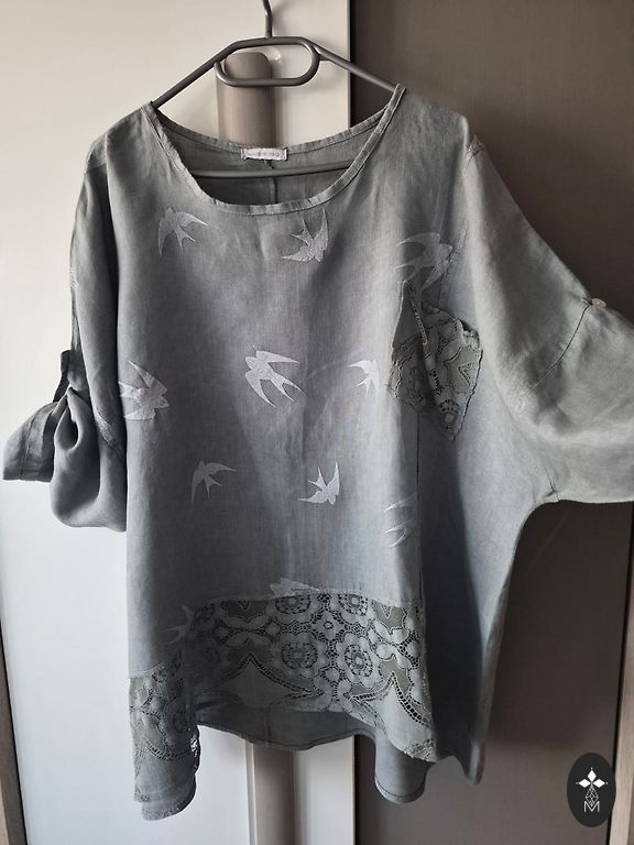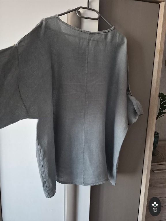 Parduodu naują lininius marškinius pilka/balta spalva, plačios rankovės, gale šiek tiek ilgesnės. Pirkau čia, bet man per dideli. Plotis tarp pažastų 61 cm, ilgis priekyje 60 cm, gale 67 cm.
