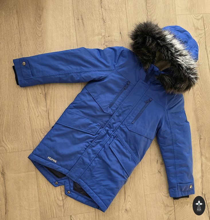 Pikendatud, fliisvoodriga tuulejope. Sobib ka märja ilmaga - libe, kummine materjal. Seisukord ideaalne, ainult nööpide juures veidi kulumist. Värv must-sinine. Suurus 128. :)