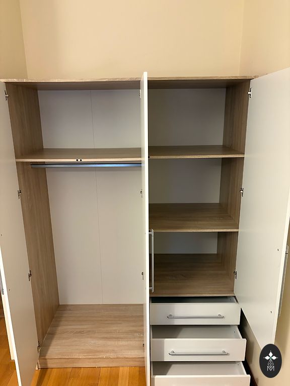 Paremal pool sektsioon riidepuuga riiete riputamiseks. Üleval (paremal pool) üks suur, mahukas riiul.