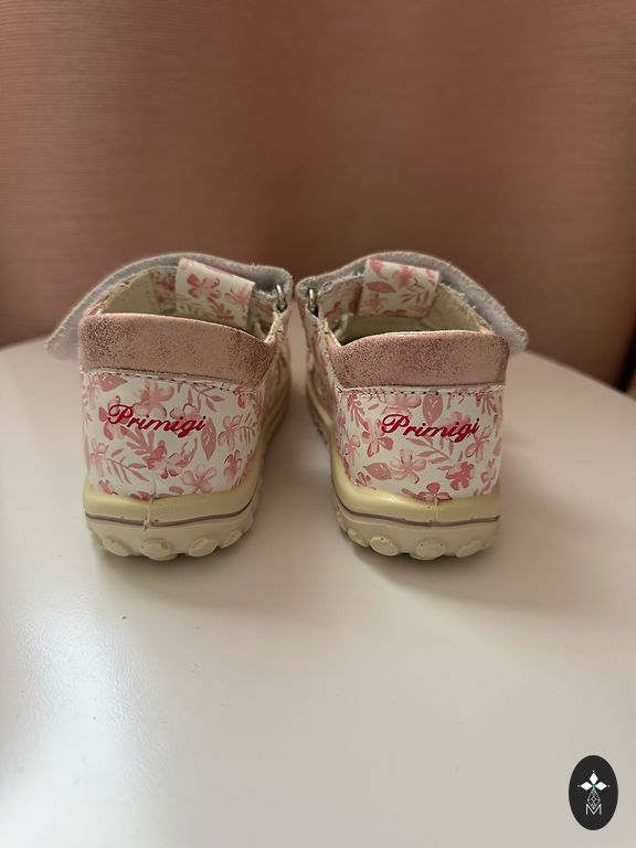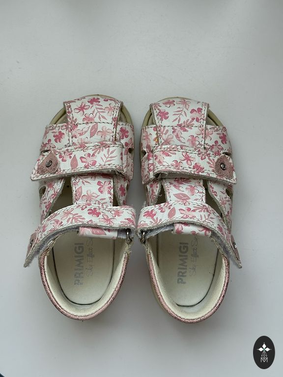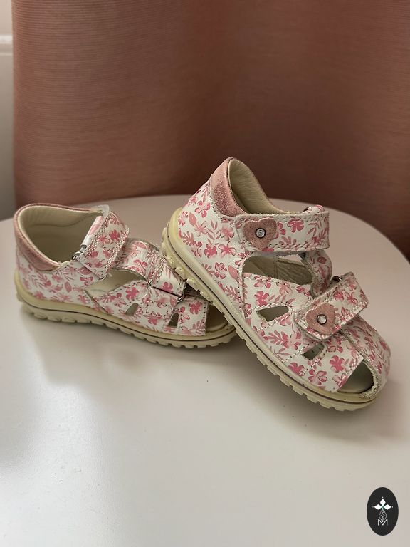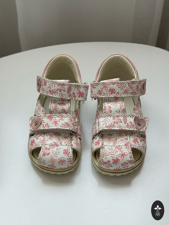 Примерно 14.5-15 см. Из дефектов: на розовых сандалиях на правой ножке не горят лампочки, на туфельках немного разошлась ткань. Белые босоножки adidas.