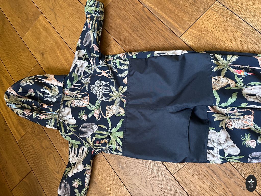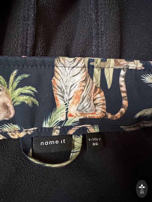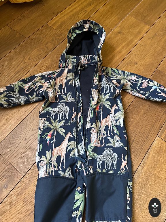 Labai patogus ir gražus kombinezonas, su gumytėmis ant kojų, kapišonu (ant kapišono atšvaitas) ilgis 69 cm, plotis ties liemeniu 28,5 cm (gali būti šiek tiek platesnis, nes ties liemeniu yra gumytė), rankovės 37cm. Pamušalas medvilninis. Tiks 92 dydžiui.