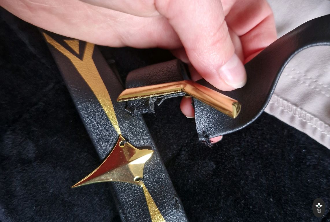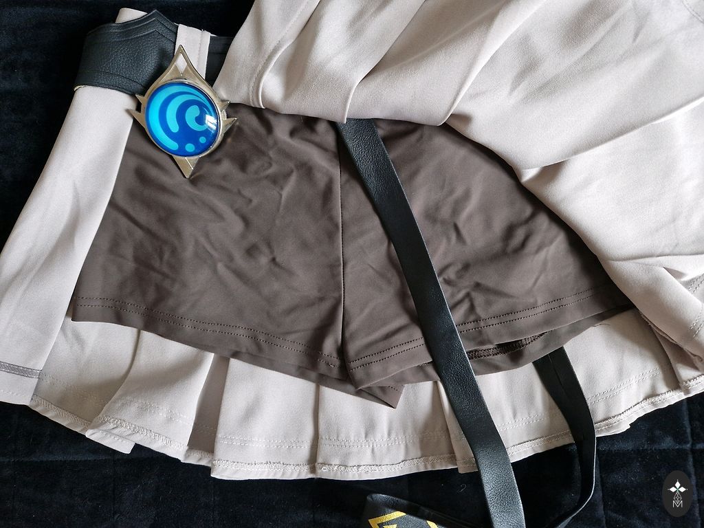 Aptemptas ties liemeniu ir pūsti rankogaliai.