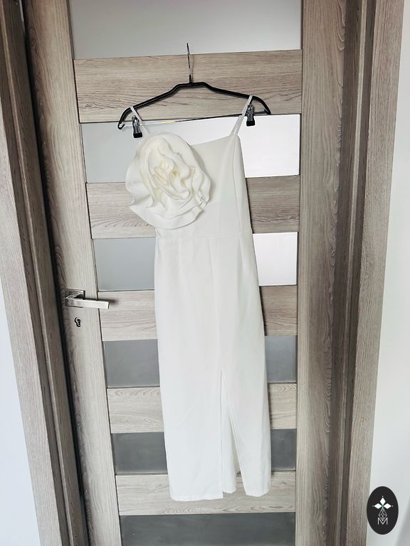 One size white dress with decorative flower and slit. Suitable for s and m size.