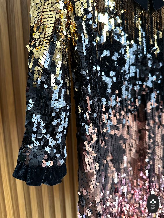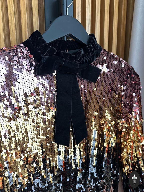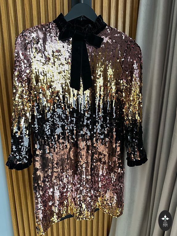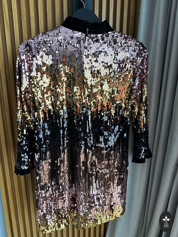 Kleita lieliskā stāvoklī bez defektiem. Bēšīga ar sudraba fliteriem. Izmērs xs/xxs. Krūtīs 40cm, gurnos 50cm, viduklis elastīgs, garums 86cm.