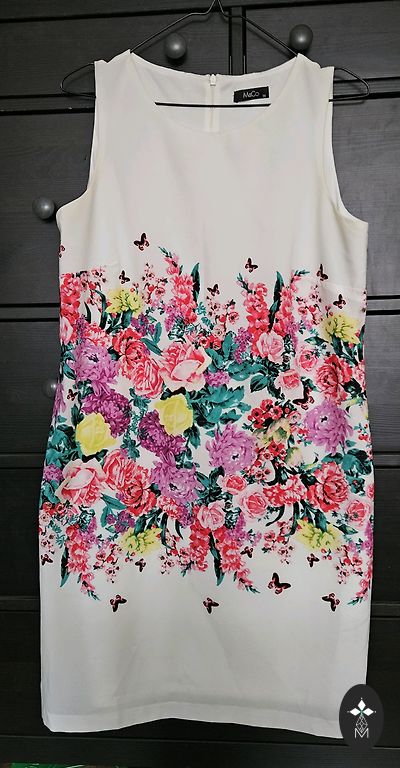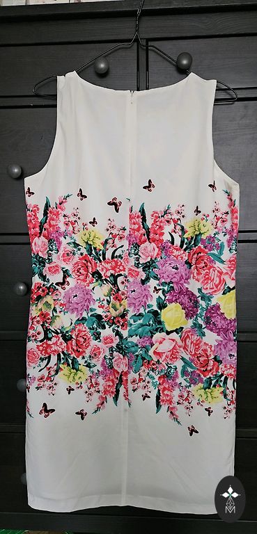 Blue dress with white, discreet pattern, lightweight. ESPRIT. Size 44. Length approx. 1 m. ¾ sleeves. 3 hidden buttons and seams on the front. Lined skirt. With fabric belt.