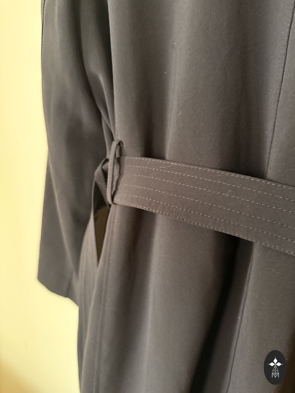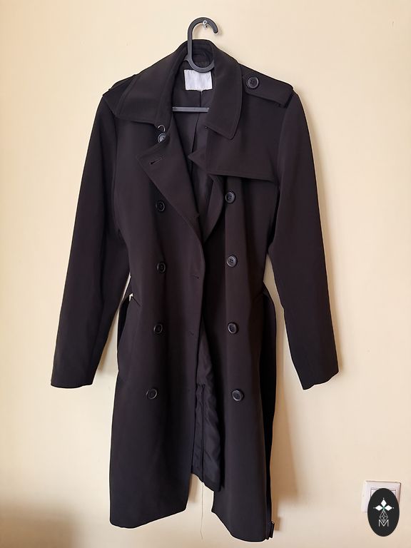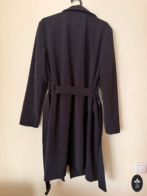 Labai įspūdingas paltas, kuris sužavės kiekvieną, kas jį dėvės. Malonus audinys ir tamsiai šokoladinė spalva. 34-36. Dydis turėtų tikti. Komplektuojamas su diržu. Gana plonas, neskirtas dėvėti šaltu oru, labiau tinka kaip tarpsezoninis paltas arba vėsesnėmis vasaros vakaromis, dėvėti ant suknelių. Ilgis nuo viršaus iki apačios 97 cm, krūtinės apimtis 80 cm.