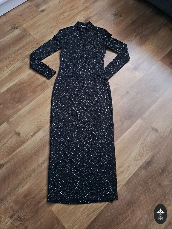 It fits sizes xs and s, and is stretchy because the base dress is made of elastane :) Very comfortable and visually stunning :))