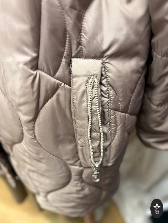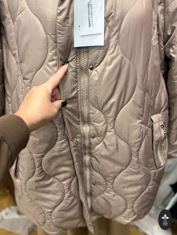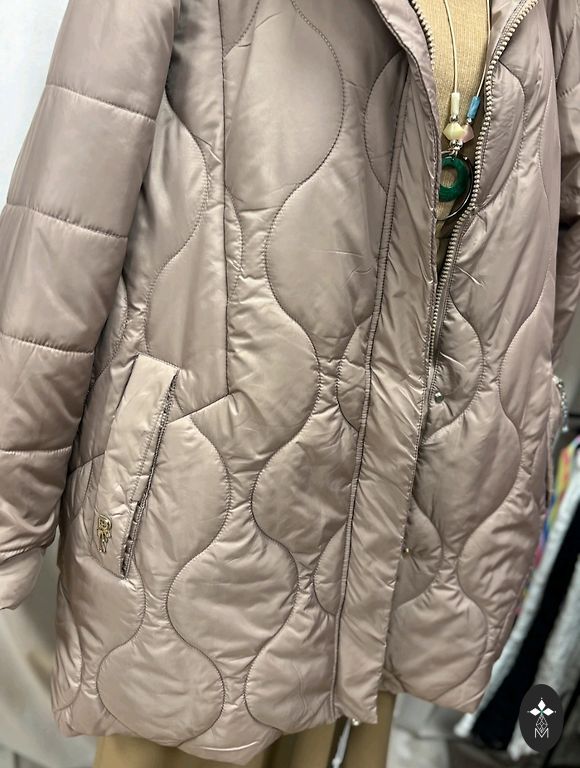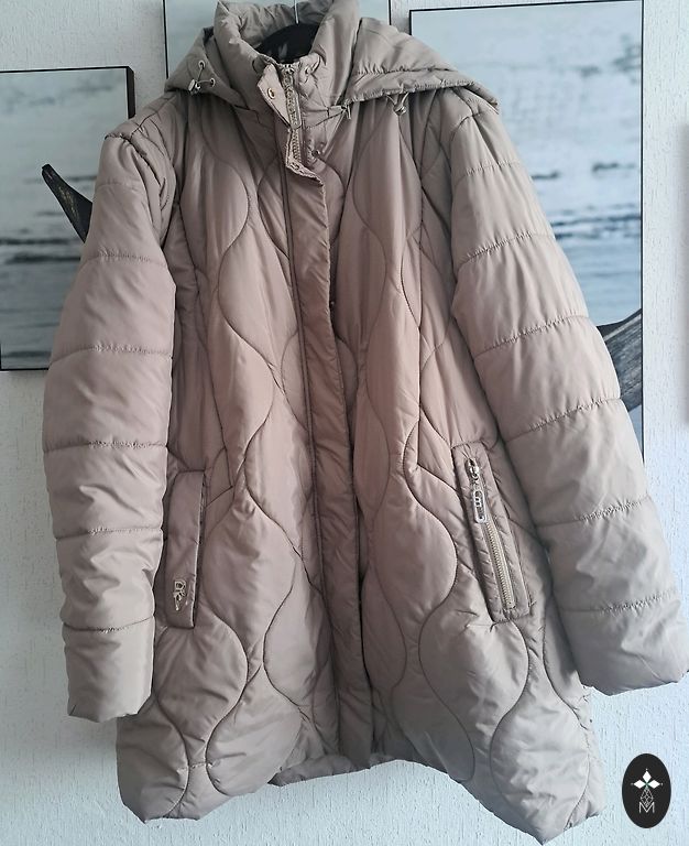 Moteriška pūkinė striukė. Ilgis 69-70 cm, rankovė 61-62 cm, didelis apykaklė.