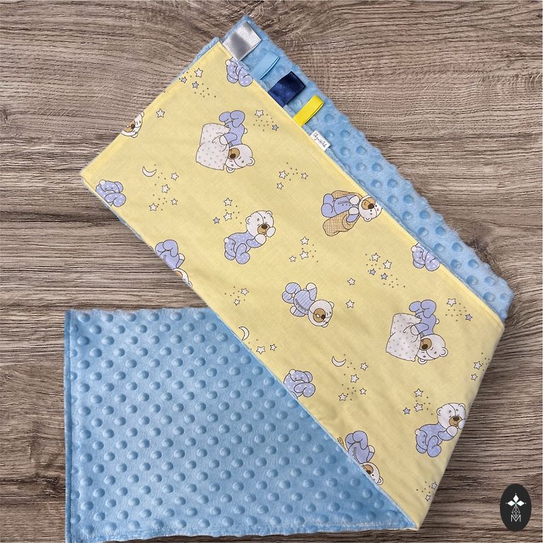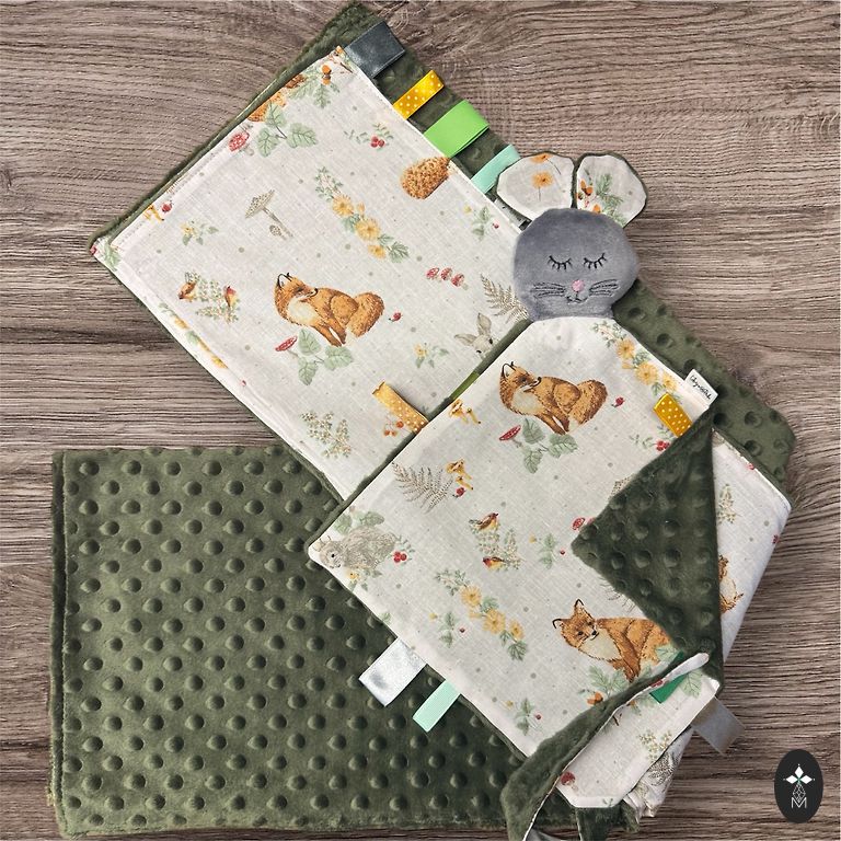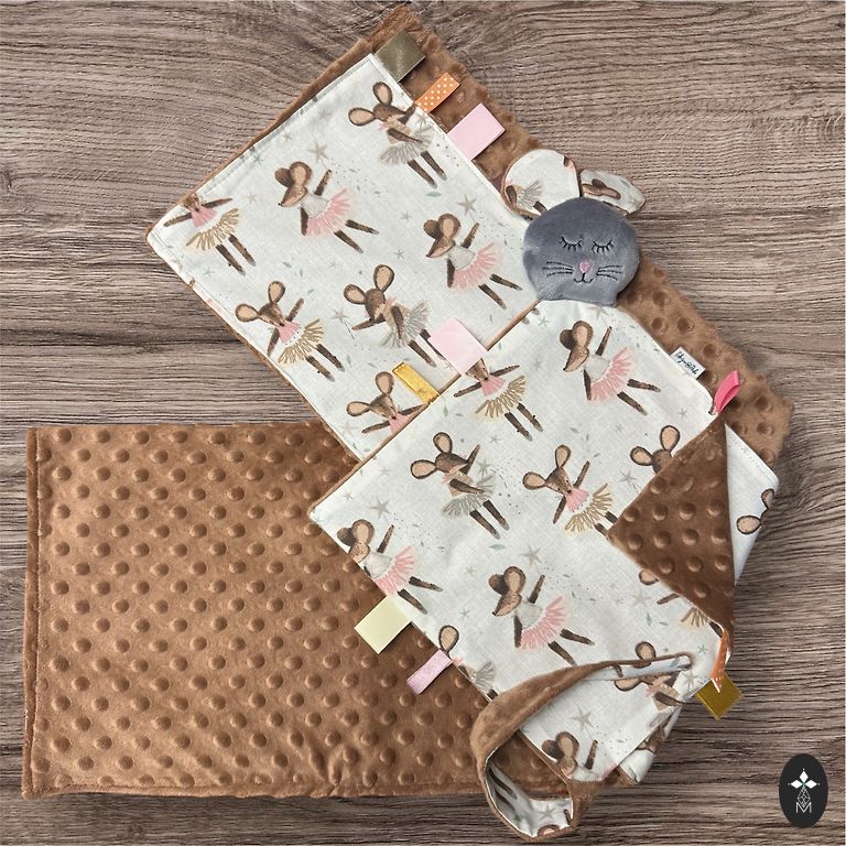Kiekvienai pelytei galima užsisakyti tokios pačios audinio antklodę 75x100 cm ir vystymosi kubą