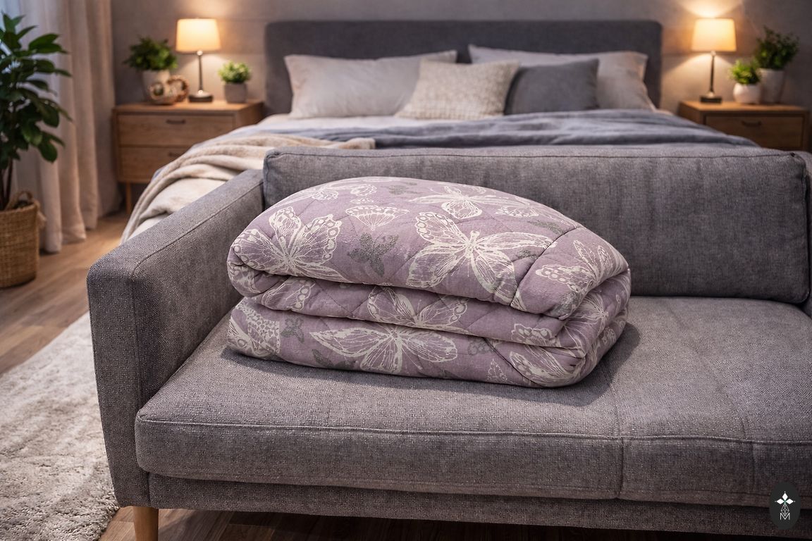 Большой 260x 250 см. С обеих сторон покрывало. Покрывало довольно плотное, можно использовать как одеяло, вторая сторона из хлопка.