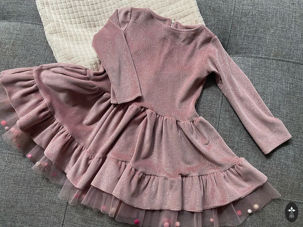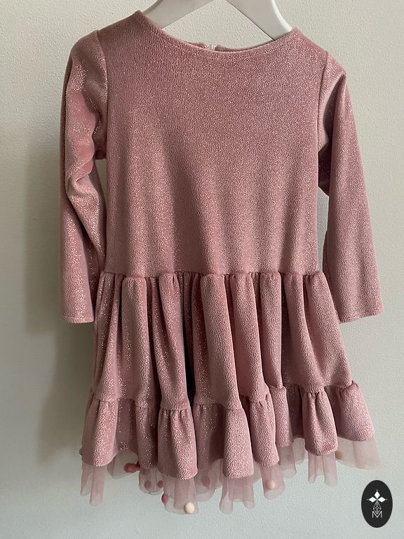 Kleitiņa mazai princesei. Zilais audums ar ziedu rakstu, ko pamanīt var gaismā. Apakšmaliņa nošūta ar baltiem ziediņiem. Daudz koši rozā tilla kārtui svārku daļā. Priekšpusē īsāka, aizmugurē garāka.