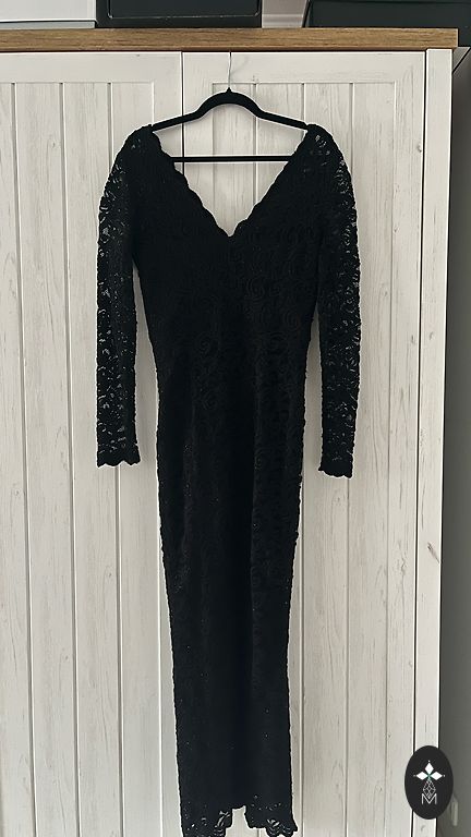 Dress after dry cleaning. Ready to use. Might be unappealing, the hidden zipper at the back works well, but needs to be pulled carefully as it tends to snag on pronounced lace. Difficult to put on alone, requires another person to help close it. Tailored by a seamstress.