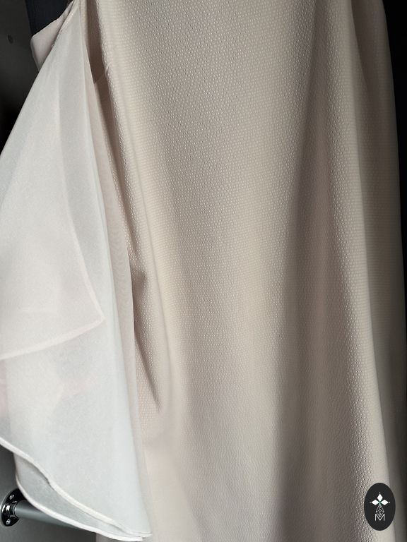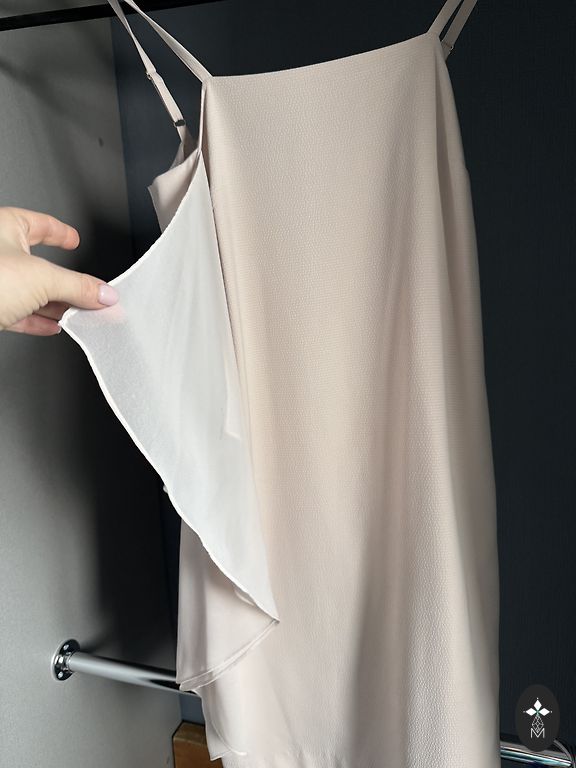 Burvīga kleita, uz auguma, ar melnu oderi, aizmugurē šķēlums. Lences sasienamas, rada elegantu un seksīgu iespaidu reizē. Auduma krāsa pateicīga - labi izskatīsies gan iesauļotam, gan neiesauļotam augumam.