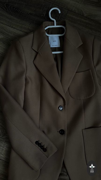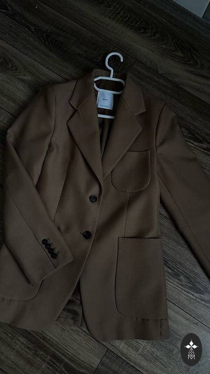 Ruda švarkas su šviesesniu rudu smulkių eglučių raštu priekyje ir ant rankovių aksominės siūlės, yra kišenės, poliesteris, viskozė, elastanas, krūtinė 122 cm, ilgis 68 cm, rankovės 61 cm, apačia 132 cm.