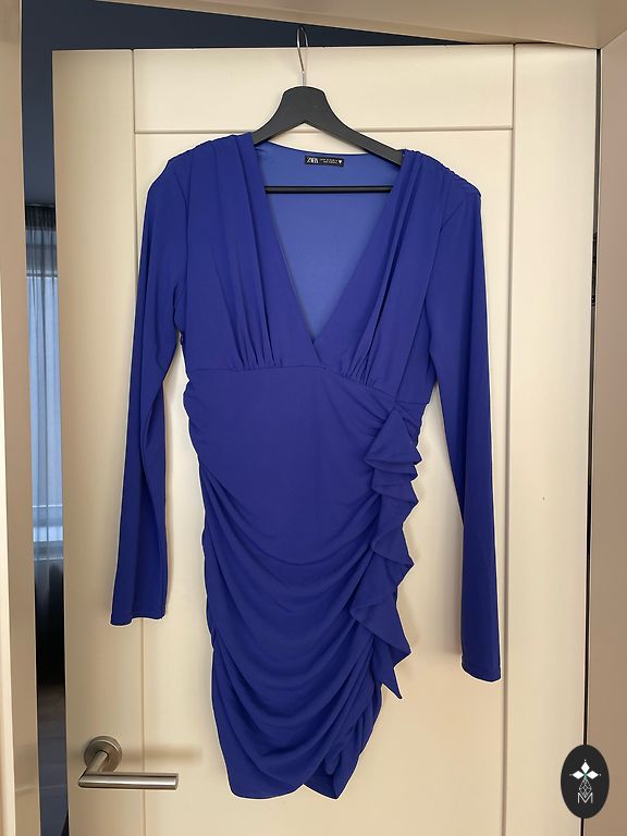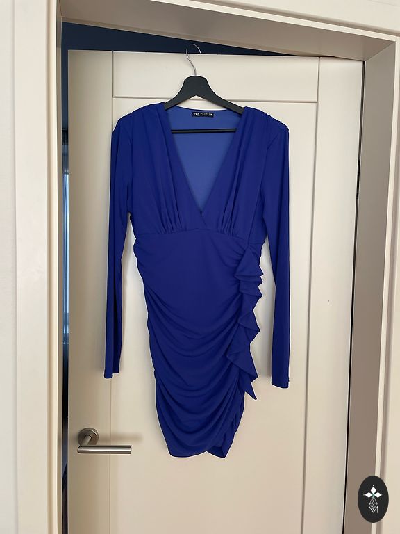 Dydis 38. Užsegimas su užtrauktuku šone ir sagomis nugaroje. Nėrinių rankovės ir puošmena priekyje, suknelė apatinėje dešinėje pusėje.