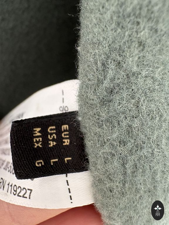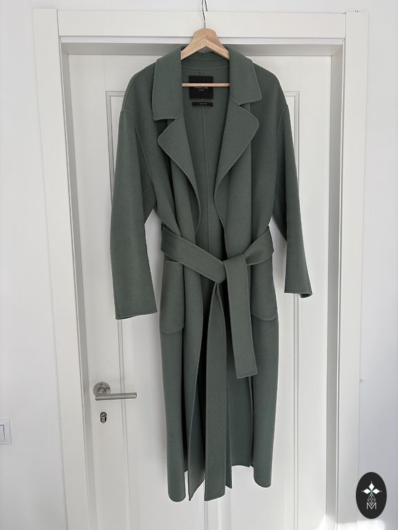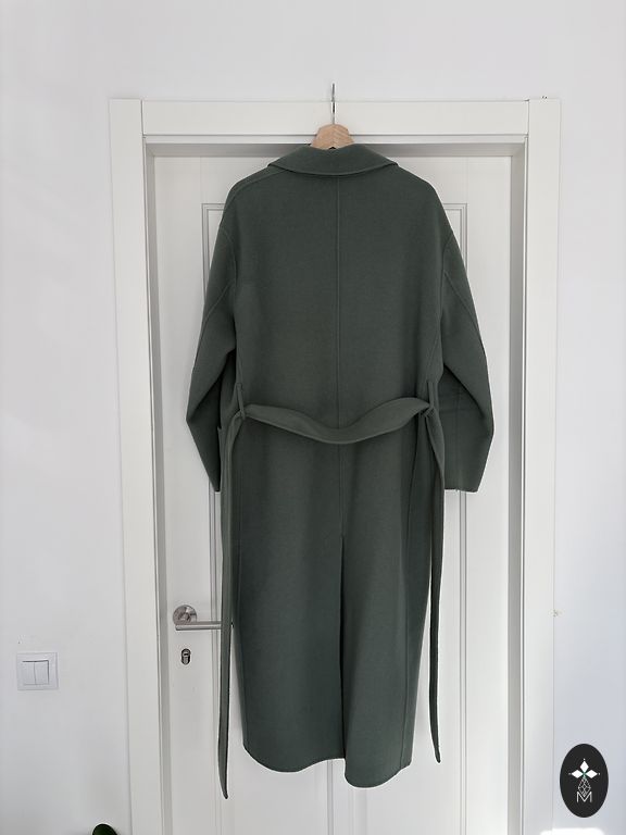 Ilus roheline, soe villane mantel (polüamiidvooder). Klassikaline sirge lõige vööga (võib ka ilma). Trukid, mis väljastpoolt ei ole nähtavad.